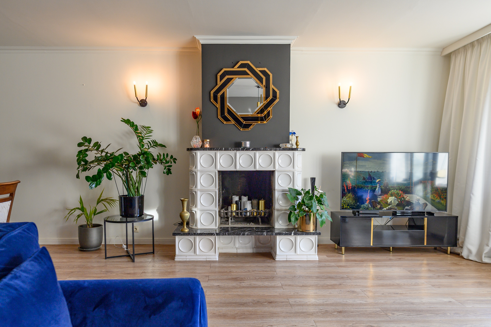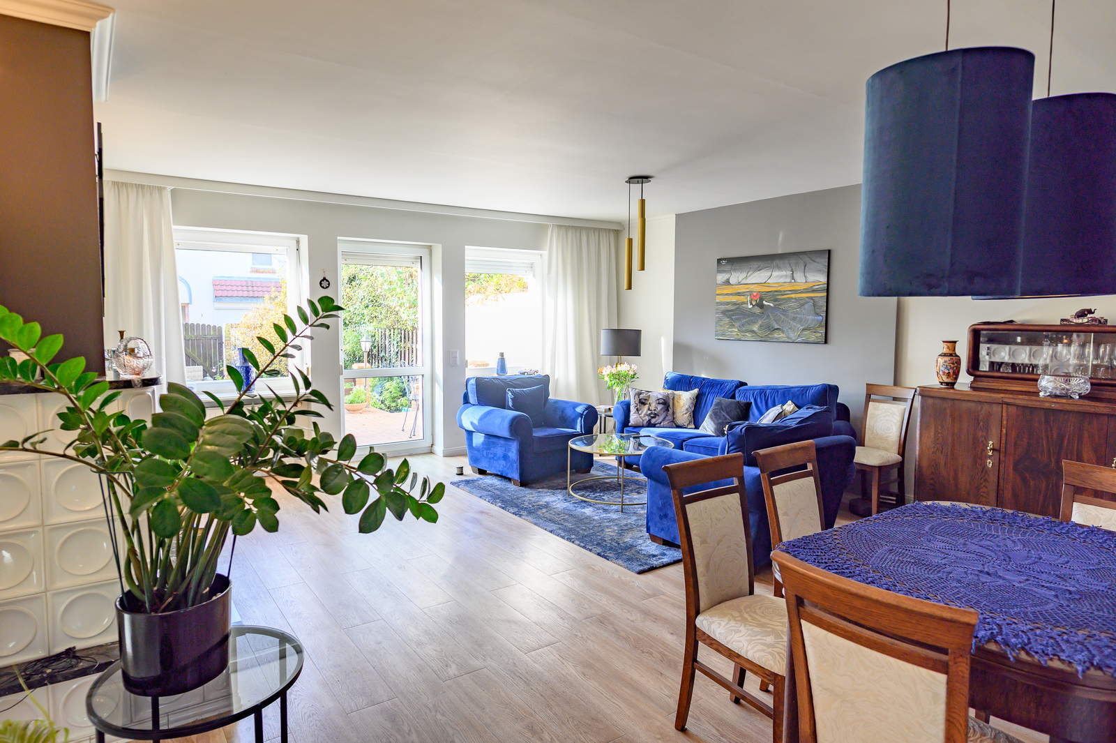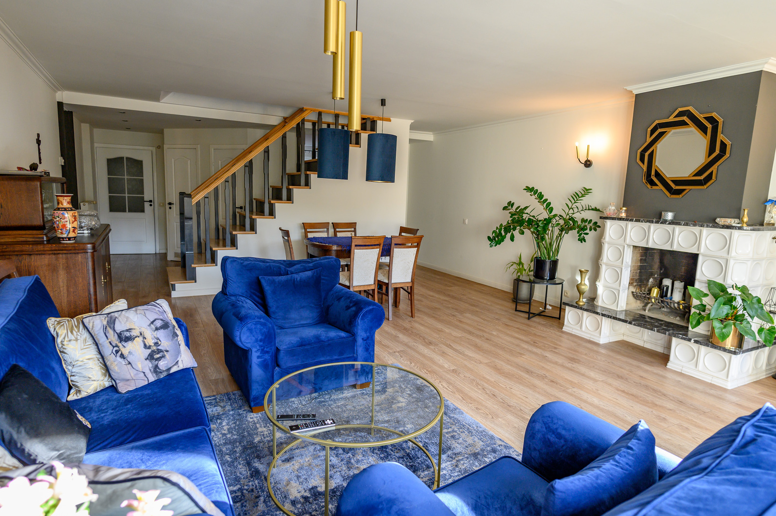 salon z kominkiem, wyjściem na taras i zagospodarowany ogród.