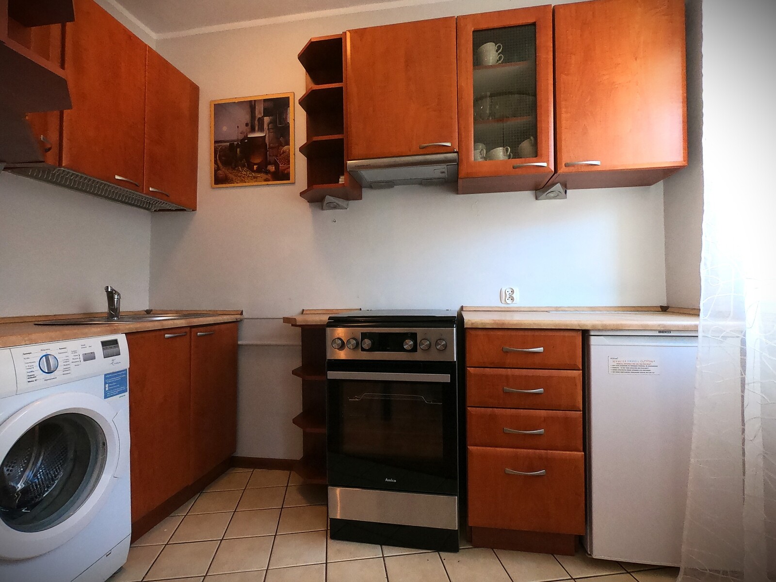 W kuchni zabudowa kuchenna, kuchenka z piekarnikiem, okap, lodówka i pralka.